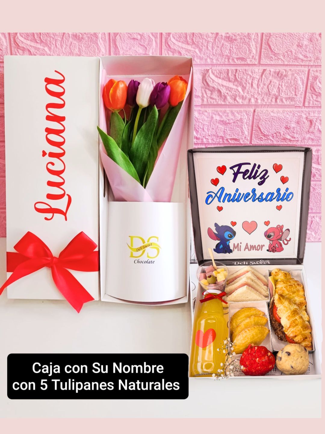 Caja de 5 Tulipanes combinados con Caja con Nombre Personalizado
